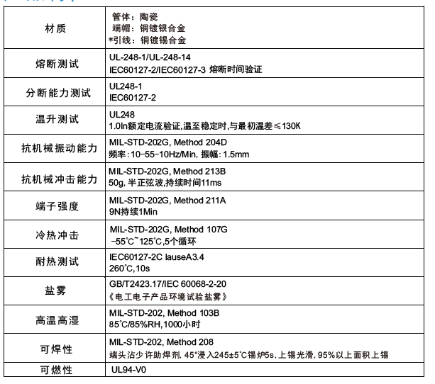 預期飛弧/熔斷時間,電流特性:當保險絲通以下述規(guī)定電流時,熔斷時間必須符合表格要求,熔斷后管體不應破裂,端蓋不應脫落。